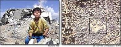 En el caso izquierdo la foto ilustra la total devastación de lo que se llamó "La masacre de Jenin". La de la derecha muestra la cuadra que fue destruida con bulldozers por el ejército israelí la semana de bombas suicidas diarias. 18