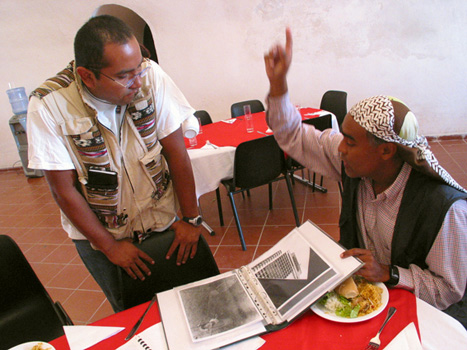Mostrando sus obras a un colega durante el Primer Encuentro Iberoamericano de Fotografia de Prensa. La Habana Cuba |