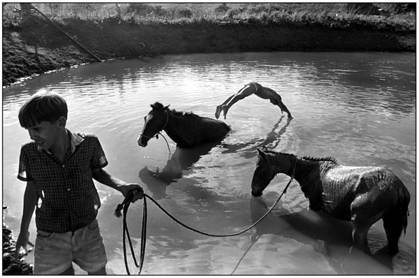 Los niños aprovechan el momento en que los caballos son llevados a bañarse, y juegan a saltar desde su lomo, a una pequeña laguna artificial que sirve para el riego de los cultivos.